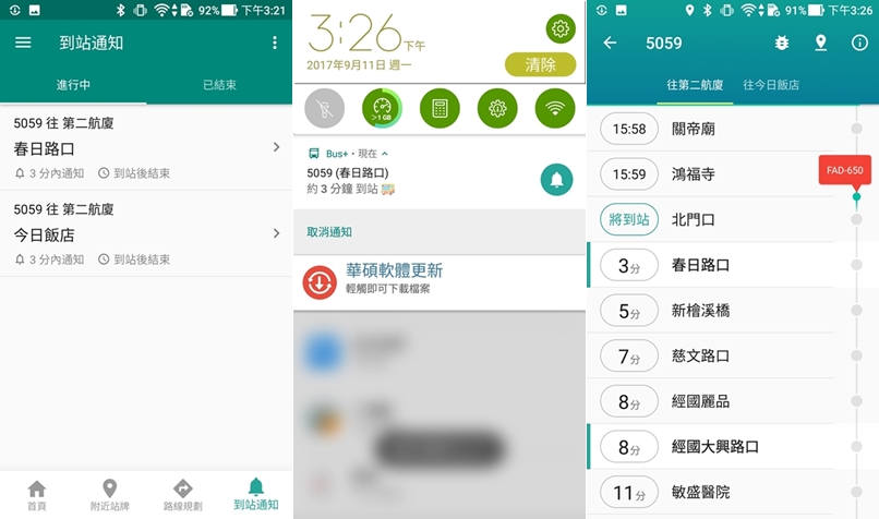 阿湯設定三分鐘並選擇已經接近中的公車,沒多久就收到通知,點進去還會顯示車牌,阿湯算一算大概三分多鐘往窗外看真的有公車開過去,真的很準。