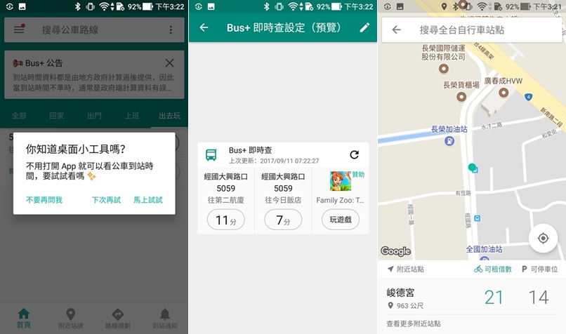 如果設定桌面小工具就可以即時查看公車動態,不用再進入 APP,另外還有一項公共自行車查詢功能,提供 Ubike、iBike、T-Bike、Cbike、Pbike 和愛心自行車位置查詢,剩餘租借數、停車位都有顯示。