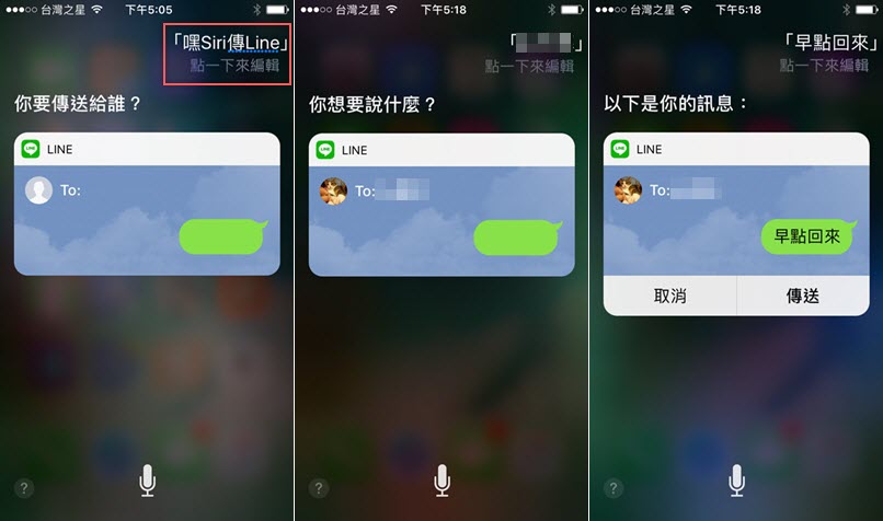 開始對話吧,阿湯說「嘿 Siri 傳 LINE」(後來試過直接說「傳 LINE」也行),Siri 會問你要傳送給誰,就說出聯絡人的名稱,如果有錯就點一下編輯,再說要傳的內容,然後點或說「傳送」即可。