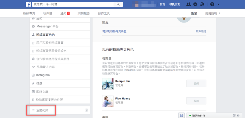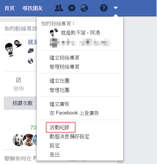先示範個人頁面,點開右上角倒三角形找到「活動紀錄」。