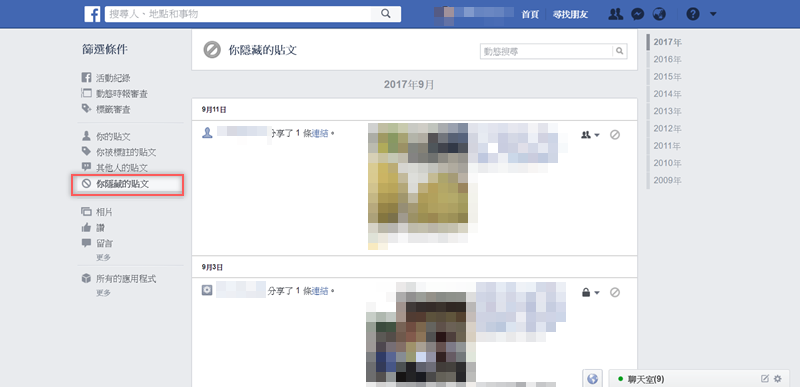然後在篩選條件往下看到「你隱藏的貼文」。