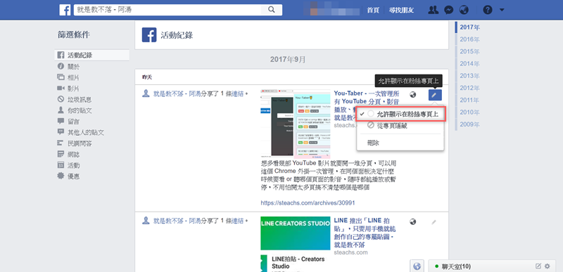 這裡會顯示你或其他人的所有貼文和按讚、留言等訊息,也是找到文章右上角點「允許顯示在粉絲專頁上」即可,也可以從左欄選擇你的貼文、其他人的貼文、留言等選項來過濾。