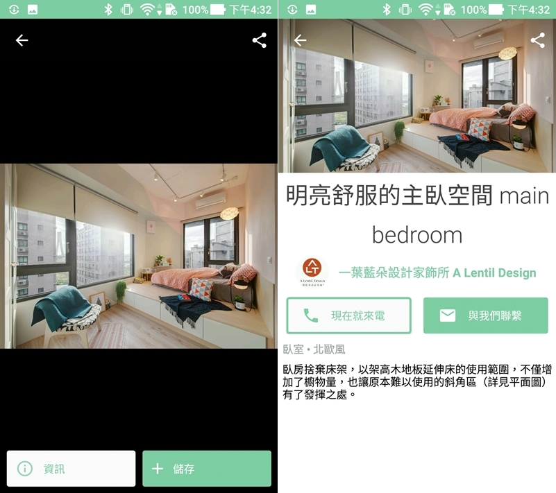 點進圖片可在下方查看資訊,會連到設計公司並提供聯絡方式,並提供設計理念簡介,像這個房間就屬於北歐風格。