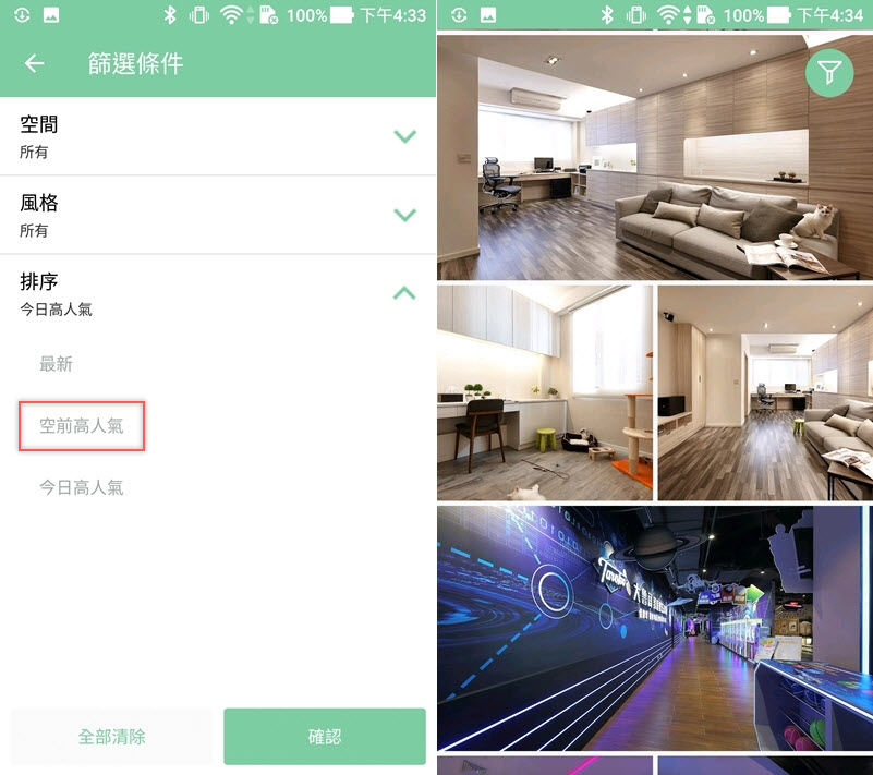 點頁面右上角圖示可設定篩選條件,來看看空前高人氣是哪些,顯示出的相片除了一般居家還有商家、營業場所的範例。