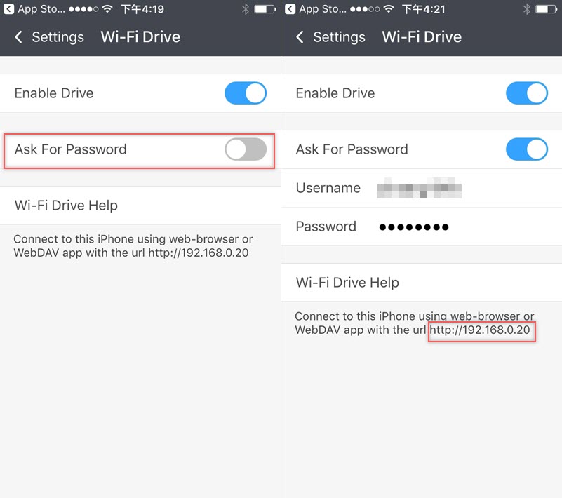 開啟「Enable Drive」後再打開「Ask For Password」,輸入手機的帳號密碼連線,然後看到最底下有一組 IP 位址,注意你的手機和電腦需要在同一個 Wi-Fi 環境下才能使用。