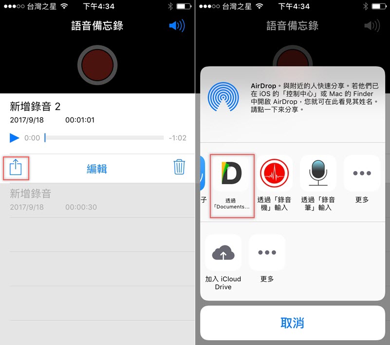 回到手機,點進你無法匯出的那個語音備忘錄,假設是「新增錄音 2」,再點左下角分享並選擇透過「Documents 6」。