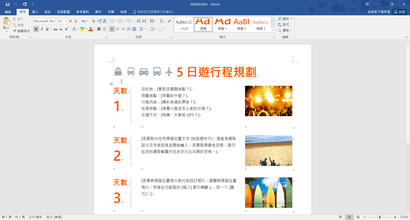 開啟後就是預設的 5 日遊範本,將中間文字的部分像「目的地」「行程內容」等等複製往下貼即可,可自由編輯字型、換顏色、樣式及插入的縮圖大小。
