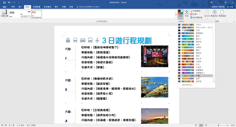 另外像是標題和文字的配色、間距等,都可以在設計這裡處理,跟 Word 大同小異,相信很多人會需要這種簡潔易懂的行程表,尤其公司活動,總不能拿手機 APP 給主管參考吧,印給同事看也比較清楚。