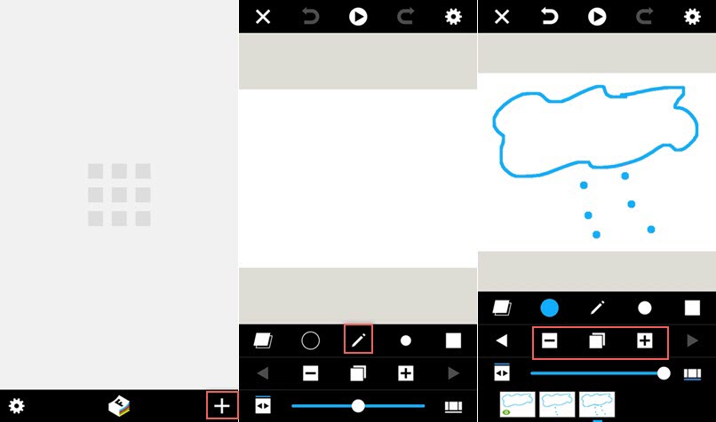 阿湯用 iPhone 來示範,開啟後從右下角加入新檔案,然後就可以利用下面的鉛筆工具,調整顏色和筆刷寬度開始畫,因為動畫都是一張一張漸變的,所以畫完一張可選複製影格,複製出來的下一張再繼續畫,或是點「+」「-」來編輯。