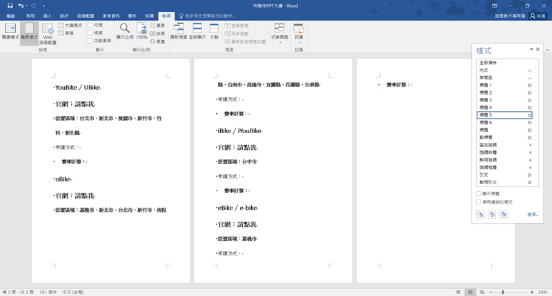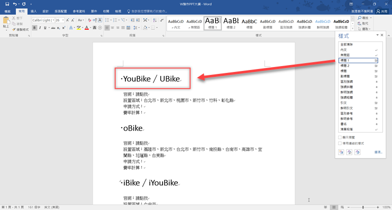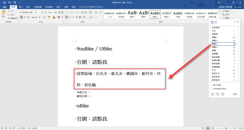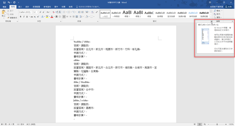 習慣用 Word 來思考的朋友,應該就是這樣一行一行去想要講什麼,現在可以試試在文字檔完成後先分段落,打開「樣式」右下角的圖示。