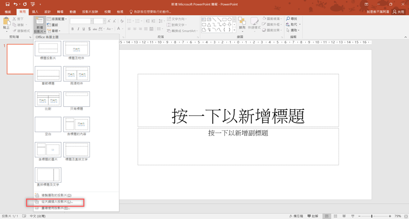 打開空白 PPT 檔案,點「新增投影片」後往下選「從大綱插入投影片」。