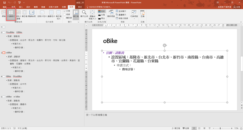 如果要修改除了直接點進投影片,還可從「大綱模式」來檢視,變更字型與顏色等,會更加清楚又有效率。