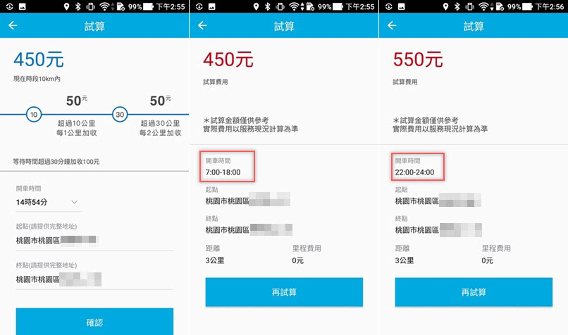 用法也跟叫車 APP 一樣,先選擇開車時間,起點、終點的完整地址來試算,上方會先顯示目前時段的收費機制,並依不同時間、距離而有所差異,像下圖就是同一個地方,但 7:00 – 18:00 只要 450 元,22:00 – 24:00 就多了一百元。