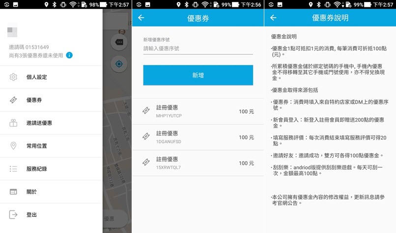 還提供註冊和邀請朋友的優惠碼可折價,不過無論是車費試算還是折價券,上車前都應該再跟司機確認好,就算真的意識不清也建議先請朋友幫你問清楚。