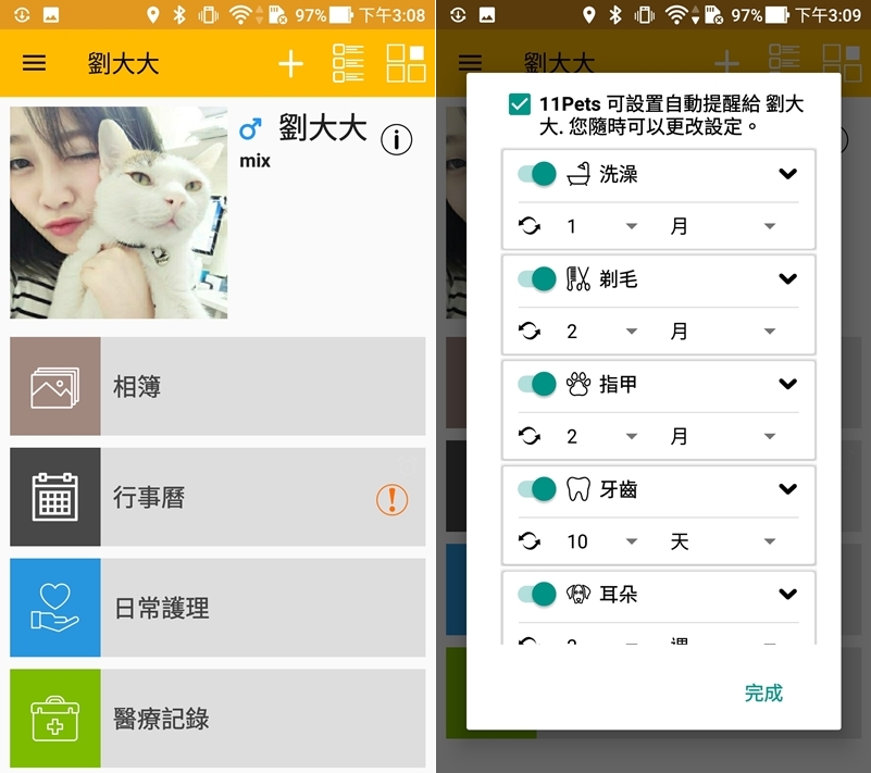 回到首頁,分為照片、行事曆、日常護理、醫療紀錄四大類,在行事曆的部分就是可設定多久要洗一次澡、檢查牙齒等等,並打開通知提醒。