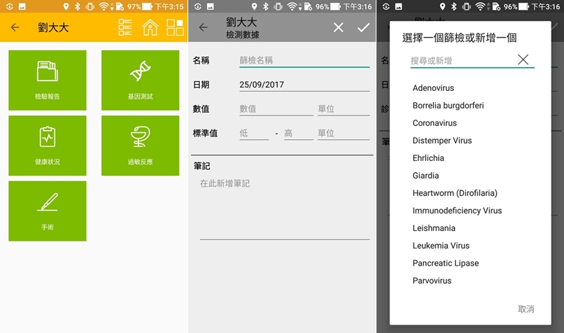 醫療紀錄的內容有檢驗報告、基因測試、檢康狀況、過敏反應和手術,像篩檢的名稱和數值、標準值範圍都能登記,找不到檢驗的名稱也能自己新增。