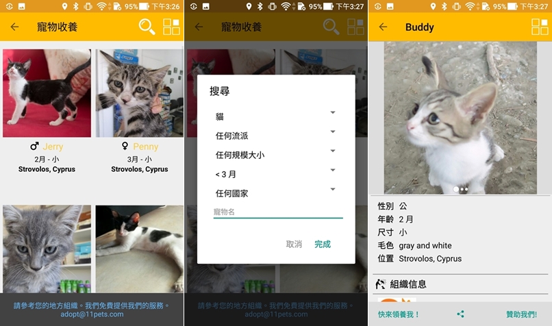 收養專區還可設定年齡和體型,因為是全世界的資料所以還可選擇國家,不過沒有台灣可指定,要收養的話建議還是上網查看各大收容所資料比較準。