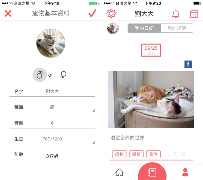 另外介紹一款「PETIME」給 iOS 用戶,不同的是這款比較基本並偏向社群分享,例如簡單的日記(資料設定的自由度很廣,年齡還可以亂選)。