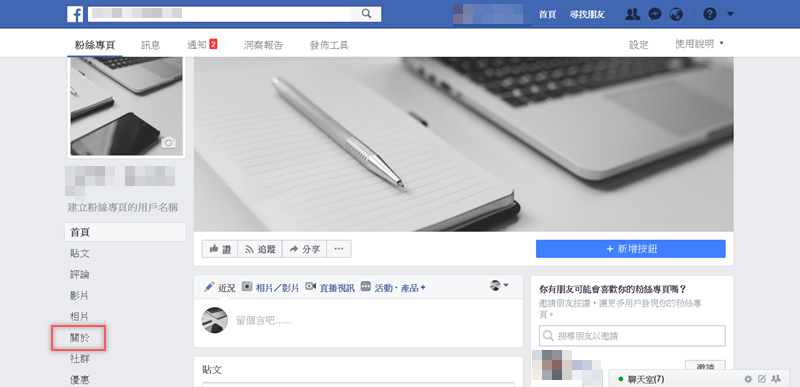 先到粉絲團首頁,看到左側的「關於」。