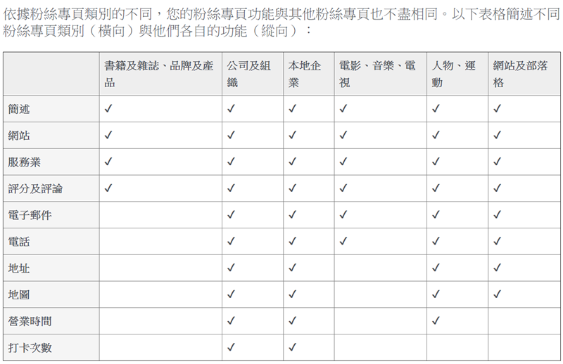 臉書其實有根據不同的類別提供一張表格可參考,大家可以確認一下自己是不是要更改,有時候改一下類別會比較容易被搜尋到哦。