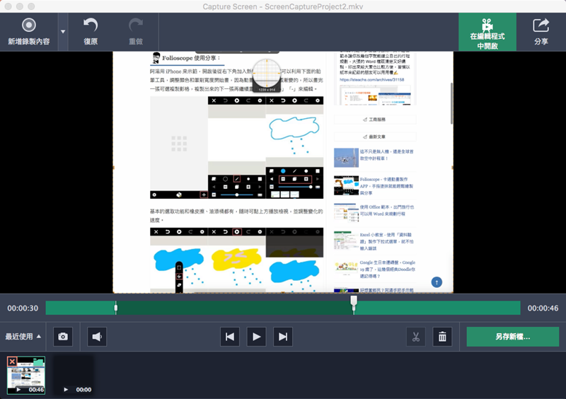 錄製完自動轉換到剪輯視窗,可在這邊先來截取需要的片段。
