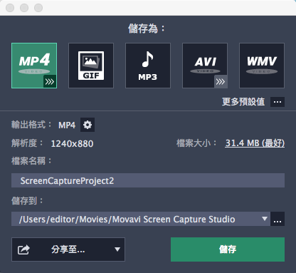 選擇輸出格式後另存新檔,有 MP4、GIF、MP3、AVI、WMV 等類型可選擇。