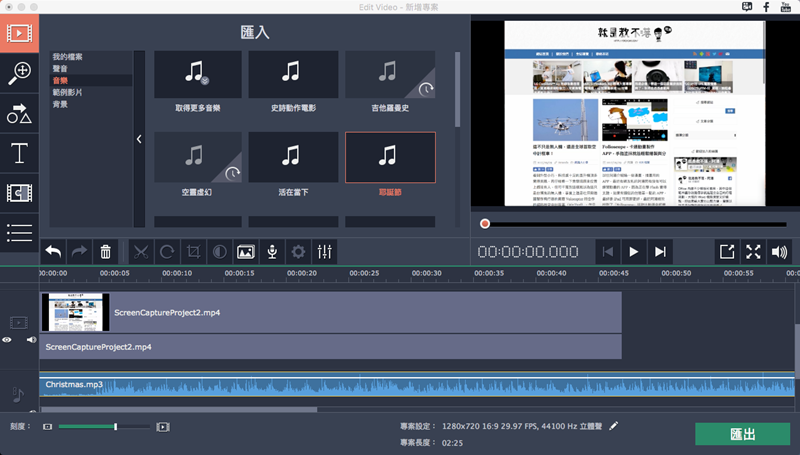 像是匯入音樂,除了可匯入自己的音檔,也提供了一些不同情境、主題的範本,例如史詩動作、吉他羅曼史、聖誕節等。
