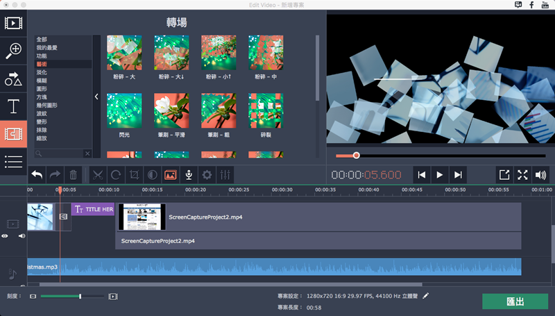 各種轉場效果是一定要的,像是粉碎特效、模糊、淡化、波紋、縮放等豐富的樣式,都可預覽後拖入軌道,讓影片不再單調。