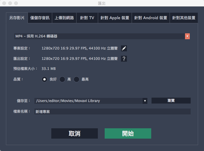 最後匯出的格式也相當多元,看是針對網路或 Apple、Android、TV 裝置都有可以選擇的檔案格式,不用擔心做出來的影片其他設備無法播放。