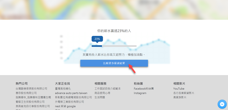 結果出現只贏過 23% 的人,還說「有些人薪水比你高又超努力,積極加油點」,這種話實在讓人不太開心耶…看看「比較更多薪資結果」。