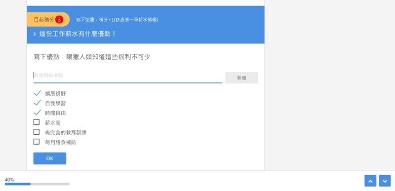 送出後顯示目前積分三分,後面幾題有完成的話就會累積分數,像是工作內容暫的時間比、優缺點、給網友的建議等等。
