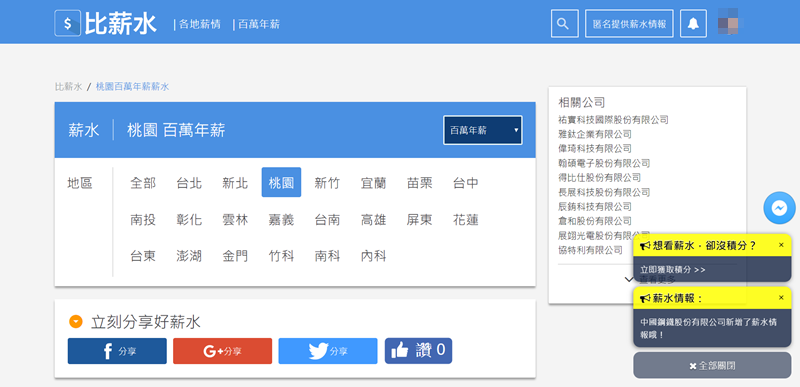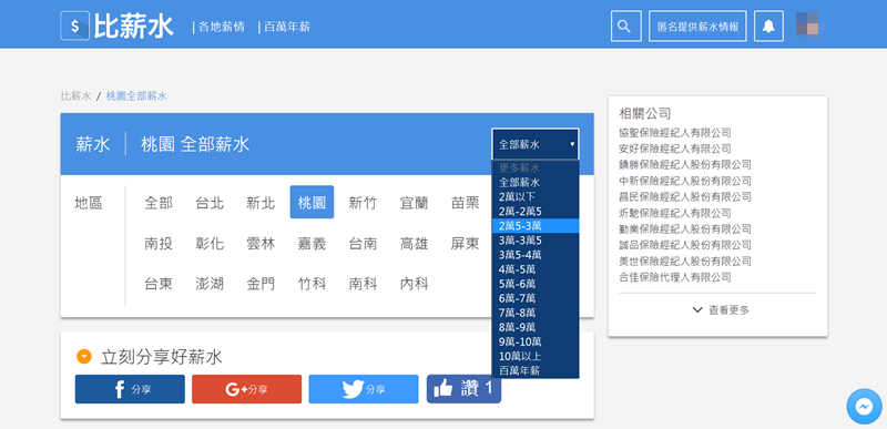 如果想知道各地薪情就選擇地區跟薪水區段,例如 2 萬 5 到 3 萬,查看看有那些公司與職缺。