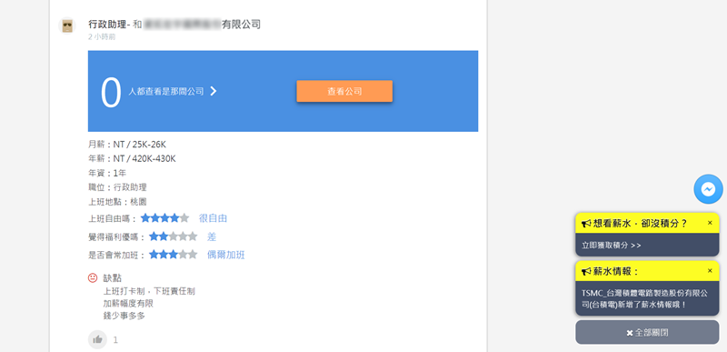 查出來第一位是行政助理,也會列出對方填寫的職務內容,不過公司名稱有馬賽克,點「查看公司」。