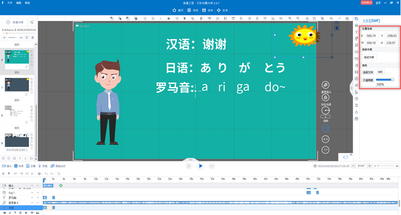 匯入後可以先點底下圖示播放一遍,大致上左邊欄是每張影格的大綱,右邊是各種素材的調整,而下方就是時間軸,可重疊多項時間軸放置文字、圖片、特效等。