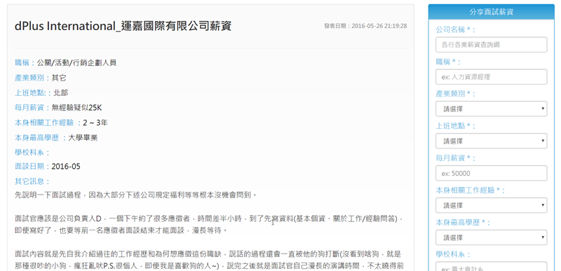 先介紹「各行各業薪資查詢網」,因為類型跟比薪水相類似,所以大家可以查詢同一間公司或相似職缺的狀況,首頁就可輸入職稱或公司名、地區與學歷等項目做搜尋,像阿湯搜尋桃園的企劃人員,出來只有四筆,並列出公司名稱、類別跟相關經驗等細目,來看這個寫薪資疑似 25K 的好了。