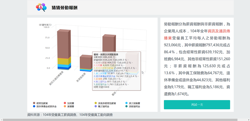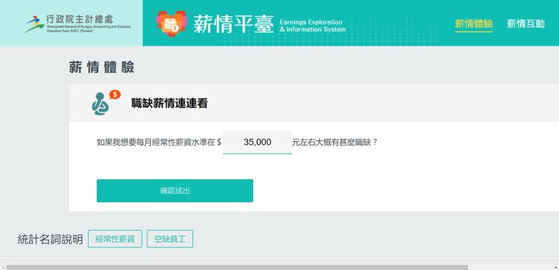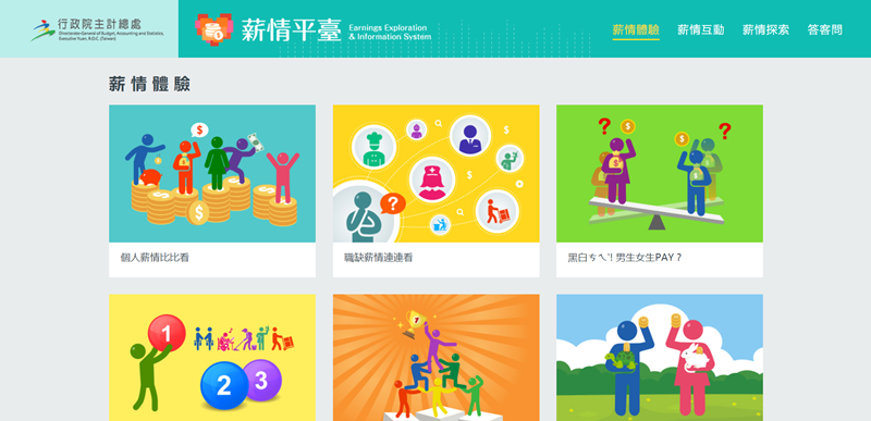 然後就是行政院主計處的「薪情平台」,分為薪情體驗、薪情互動、薪情探索三大塊區域,先來看體驗區。