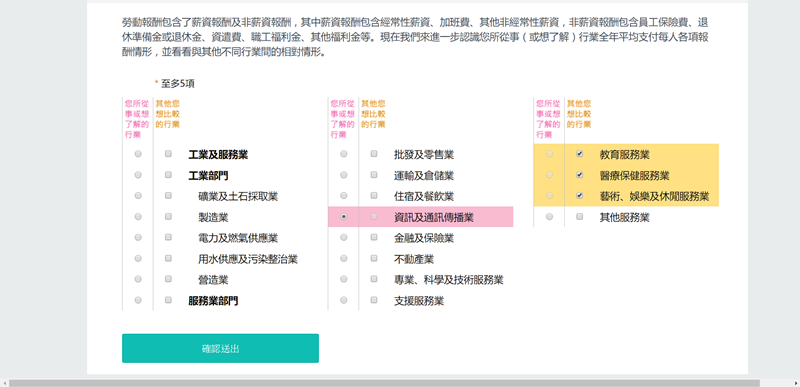 再來算「勞動報酬」,選擇想了解或從事的行業,再選擇想比較的行業。