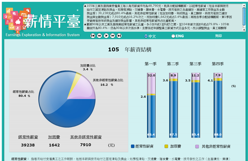看一下去年的薪資結構好了,會依經常性薪資、非經常性薪資、加班費所佔比例來顯示,如果不太清楚可看下面的註解。