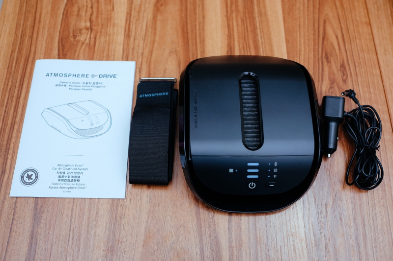 安麗車用空氣清淨機包括使用手冊、魔鬼氈束帶、空氣清淨機主機以及車載電源線。