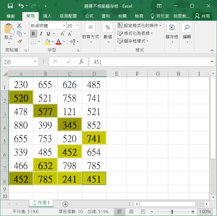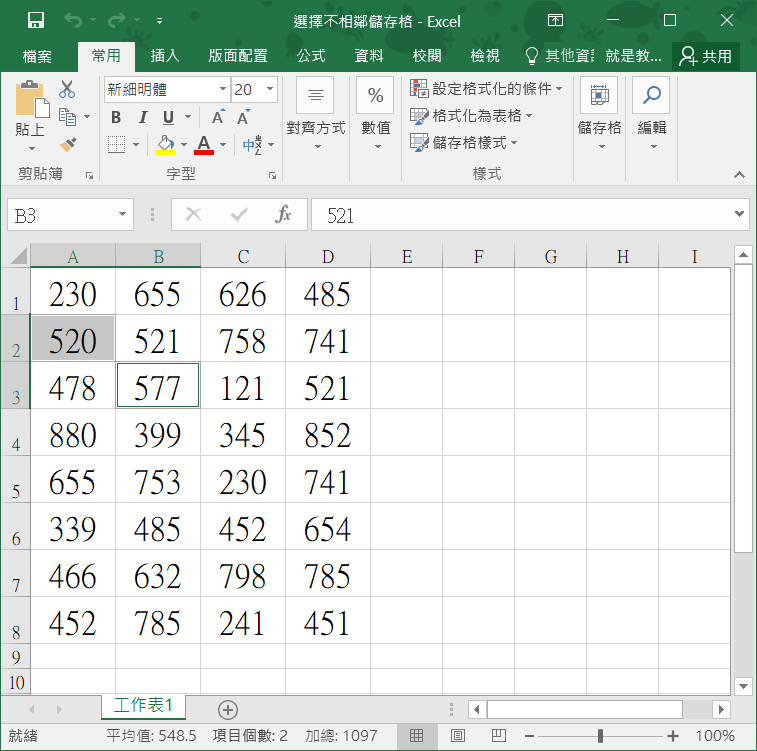 先來看鍵盤+滑鼠的方式,先用滑鼠點選其中一個儲存格,假設是左上角「520」這一格。