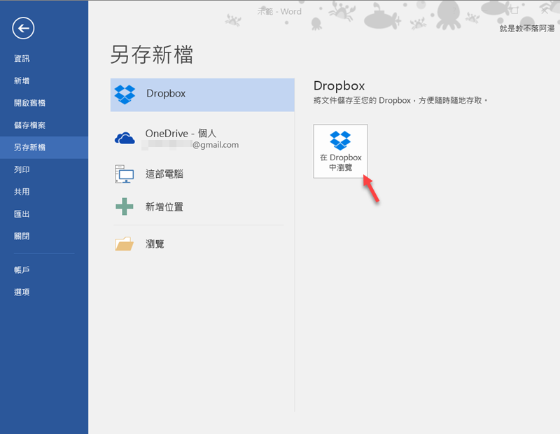 重新開啟 Word 後另存區的上方就出現 Dropdox,可以新增儲存位置了。