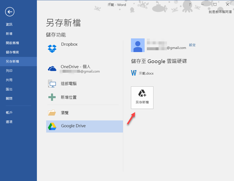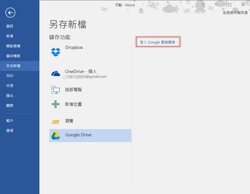 或者你去另存新檔的地方,也會看到最底下的 Google Drive 選項,點選之後登入雲端。