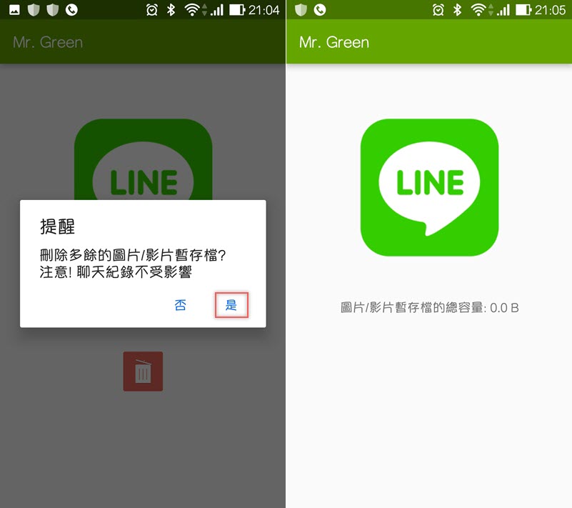 Android 版比較麻煩一點,先下載「Mr. Green」這款 APP,開啟後點下方 Line 圖示,會自動計算暫存檔的總容量,阿湯這支手機的 Line 比較常用所以累積到 837.9MB。