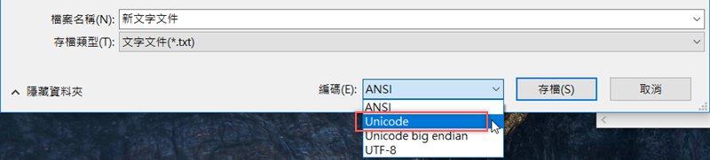 最後存檔要注意,編碼的地方要點開來改選「Unicode」,不然待會匯入你會發現全部都是亂碼。