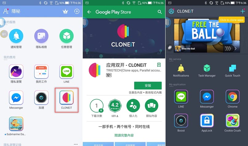 雙開功能要從首頁的「CLONEiT」圖示進入,但卻不是內建的要另外下載,就看大家的需求,阿湯用了一下是覺得還不錯速度蠻快,而且配合這款 APP 就能連多開的程式所產生的通知,也一起隱藏比較好管理。
