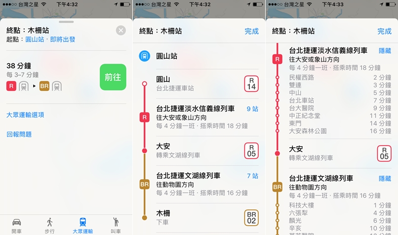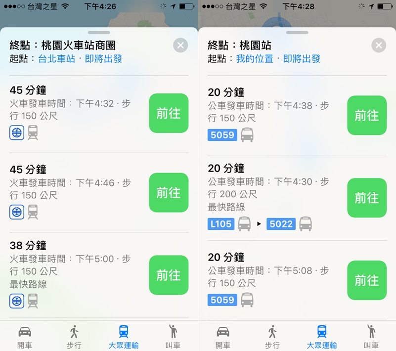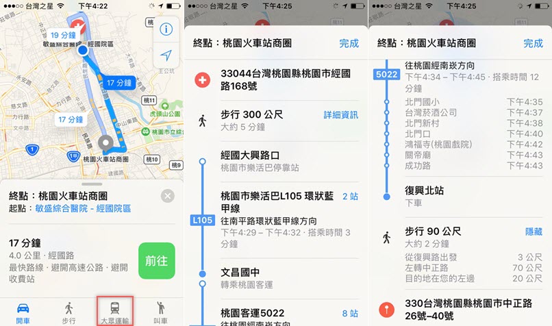 輸入起點與終點後,下方選擇大眾運輸,就會告訴你該怎麼走,坐什麼車、幾點的車、轉乘資訊,以及車站站牌、到站時間,包括下車後往哪個方向走都有,相當詳細。