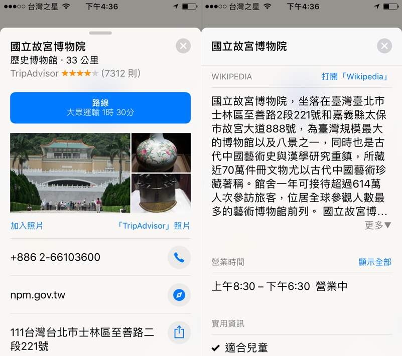 如果輸入景點名稱除了一樣可規劃路線之外,還會有像地址電話、官網、開放時間、簡介等,底下還有其他網友的評價可參考。