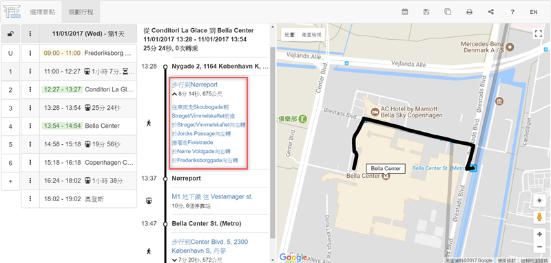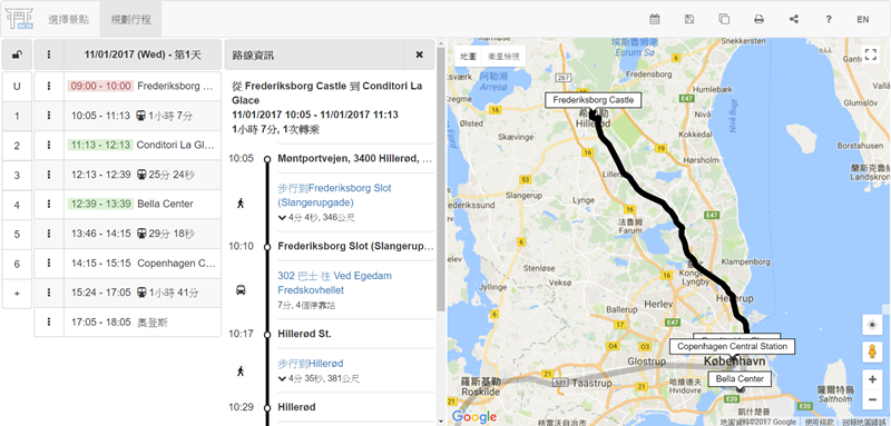 初步排完像這樣,可對照地圖查看路線,坐什麼車、往哪裡、距離多遠都很清楚。
