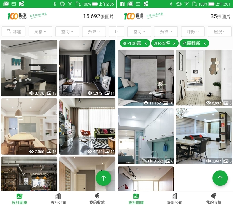 首頁顯示目前收集了 15,692 張圖片,可直接輸入篩選條件,如坪數大小、預算範圍、建築風格、用途等等,像阿湯就設定了老屋翻新、20-35 坪的條件,其餘不變。