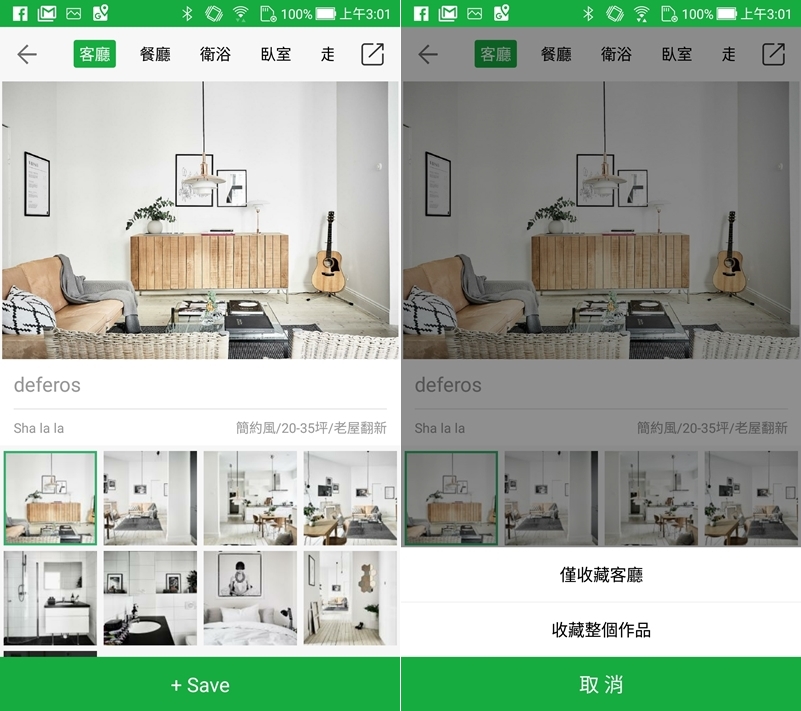 點進範本後底下是所有實體圖片的縮圖,可直接滑動瀏覽或從上排切換區域,喜歡的就點 Save 收藏,並選擇單張或整個作品。